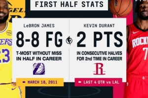 上半场詹姆斯8中8砍下18分,杜兰特3中1仅得2分