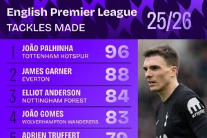 体育资讯3月9日讯 Squawka统计本赛季球员在英超的成功抢断次数,并列出榜单,帕利尼亚96次居首。