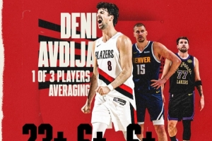 本赛季,阿夫迪亚场均23.9分7篮板6.7助攻;约基奇场均27.9分12.9篮板10.9助攻;东契奇场均33.5分7.7篮板8.3助攻。