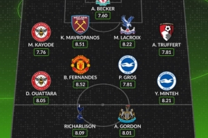 中场:瓦塔拉(布伦特福德)、B费(曼联)、格罗斯(布莱顿)、明特(布莱顿)