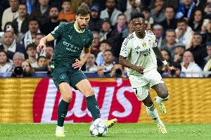 体育资讯3月18日讯 欧冠1/8决赛次回合,皇马客战曼城,维尼修斯在比赛上半场点射破门。